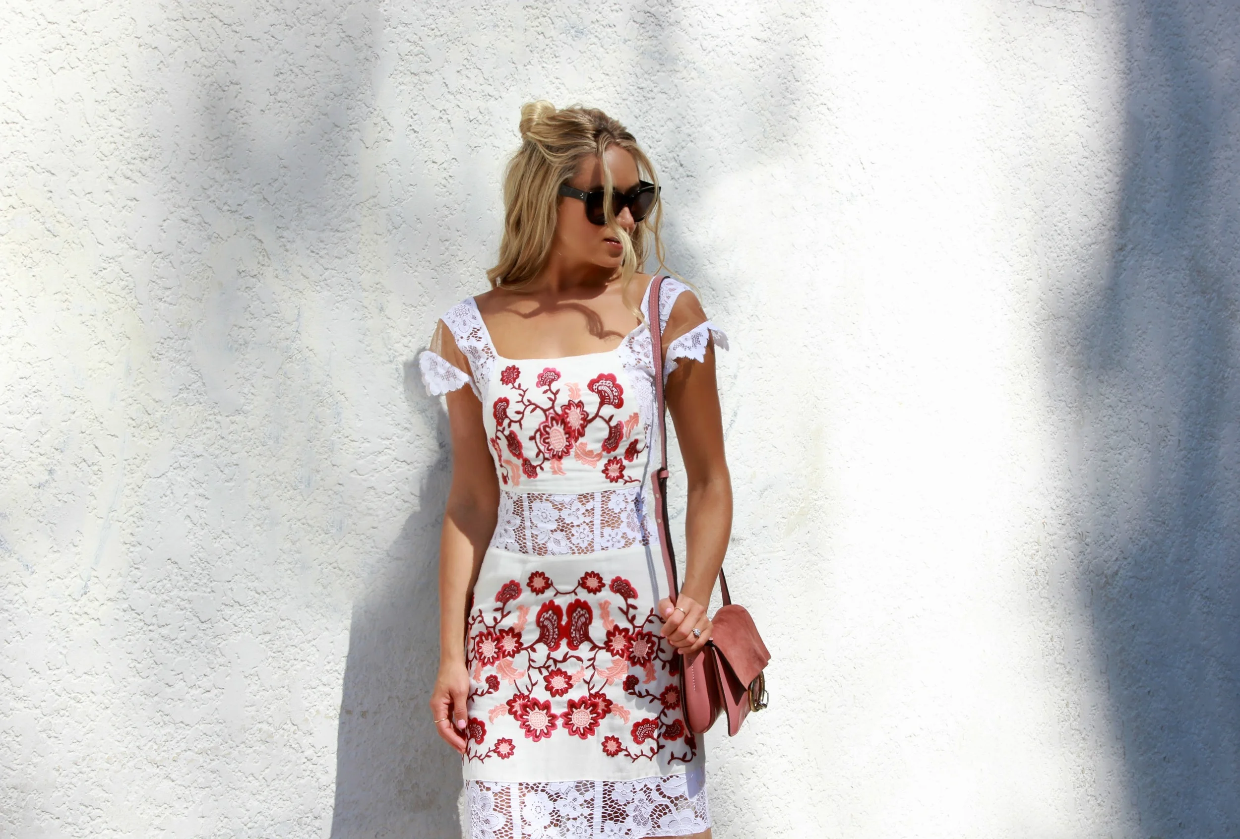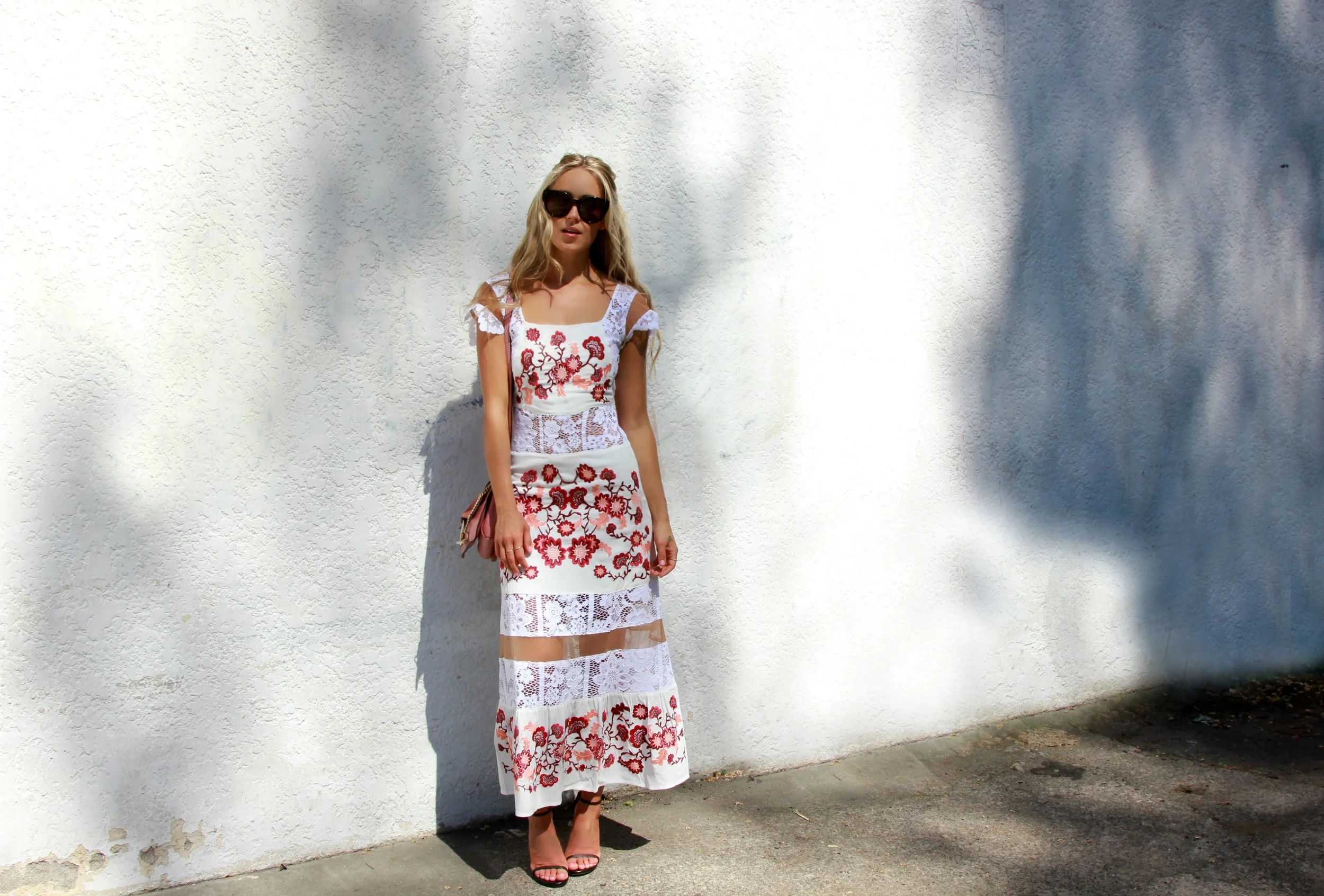 For Love and Lemons "Cecelia"Dress via Revolve, Stuart Weitzman Heels, Chloé Bag, Céline Shades